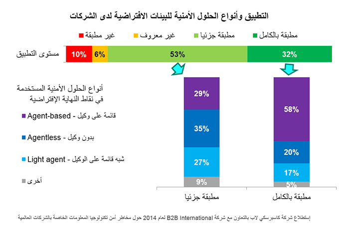 كشف استطلاع اجرته كاسبرسكي لاب بالتعاون مع شركةB2B International لعام 2014 حول مخاطر أمن تكنولوجيا المعلومات الخاصة بالشركات العالمية والذي شمل 27 دولة، بما فيها المملكة العربية السعودية ودولة الإمارات العربية المتحدة، بأن 58% من المؤسسات التي تطبق حلول أمن البيئات الافتراضية بالكامل لم تحسن استغلال منافع البيئة الافتراضية نتيجة لعدم تطبيق افضل حلول الأمن المتاحة. فيما أظهر الاستطلاع أن 69% من الشركات حول العالم قد قامت بتطبيق حلول أمن البيئات الافتراضية جزئياً أو لم تقم بتثبيت أي من تلك البرمجيات الأمنية على الإطلاق.