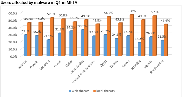 وأظهرت إحصائيات خدمة Kaspersky Security Network السحابية أن 27.3% في المعدل من جميع المستخدمين في منطقة الشرق الأوسط وتركيا وإفريقيا تأثروا خلال الربع الأول من عام 2019 بحوادث مرتبطة بتهديدات الويب، ما يُبرز الحاجة المستمرة إلى تعزيز الوعي والتثقيف الأمنيين. وضمّت المملكة العربية السعودية أكبر عدد من المستخدمين المتأثرين بهذه التهديدات، بنسبة 35.9%، في حين أن ناميبيا كانت أقل الدول تأثراً (18.5%). وقد أبلغ ما يقرب من نصف المستخدمين (بمعدل 49.3%) في المنطقة عن تهديدات محلية، كتلك التي تنتشر في الشبكات المحلية عبر الأقراص المدمجة أو قطع الذاكرة المحمولة USB. وقد وُجد أعلى تركيز لهذه التهديدات في كينيا (56.8%)، وأقلّه في جنوب إفريقيا (43.6%).