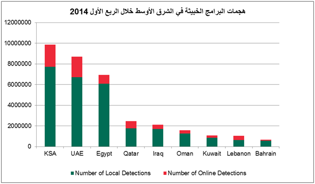 يذكر أن العدد الأكبر من مختلف أنواع الحالات كان قد رصد في المملكة العربية السعودية، علماً بأنه تم منع ما مجموعه 9.8 مليون هجمة تقريباً، أي حوالي أربعة أخماس هذه التهديدات المحلية. تأثر 43.8% من المستخدمين بهجمات البرمجيات الخبيثة على ذاكرات التخزين القابلة للإزالة (USB) وأقراص الفيديو الرقمية (DVD) والشبكات المحلية، في حين أن 28.1% تأثروا بالتهديدات الناشئة عن طريق الإنترنت. جاءت دولة الإمارات العربية المتحدة بعد المملكة مباشرة بواقع 8.7 مليون حالة تم الكشف عنها، منها 1.97 مليون تهديد على الإنترنت (تأثر منها 26.7% مستخدماً، في حين واجه 42.6% تهديدات محلية).