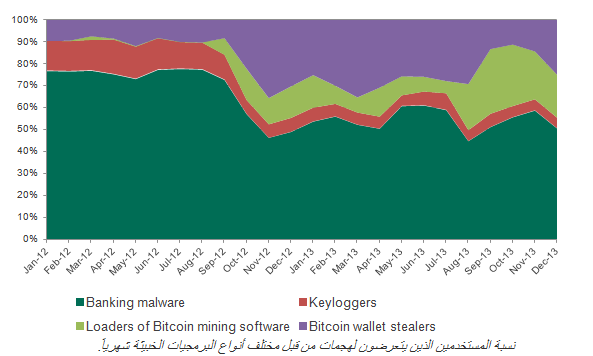 وقال سيرغي لوجكين، باحث أول في الأمن، كاسبيرسكي لاب: "خلال عام 2013 ارتفعت قيمة محفظة bitcoins إلى أكثر من 85 ضعفاً، وهذا بالطبع جذب انتباه مجرمي الانترنت. وبنهاية العام، بدأ عدد المستخدمين الذين تعرضوا لهجمات البرامج الخبيثة التي تستهدف محافظ bitcoins يقترب من عدد أولئك الذين واجهوا المزيد من الهجمات الإلكترونية التي استهدفت الخدمات المصرفية التقليدية. ينبغي على مالكي العملات الرقمية بالذات أن يتوخوا الحذر، لأنه قد يتعذر عليهم استعادة أي أموال مسروقة. وهذه هي المخاطر الكامنة في استخدام العملة الرقمية مثل Bitcoin الذي يتم تداولها بين الناس دون أي رقابة حكومية."