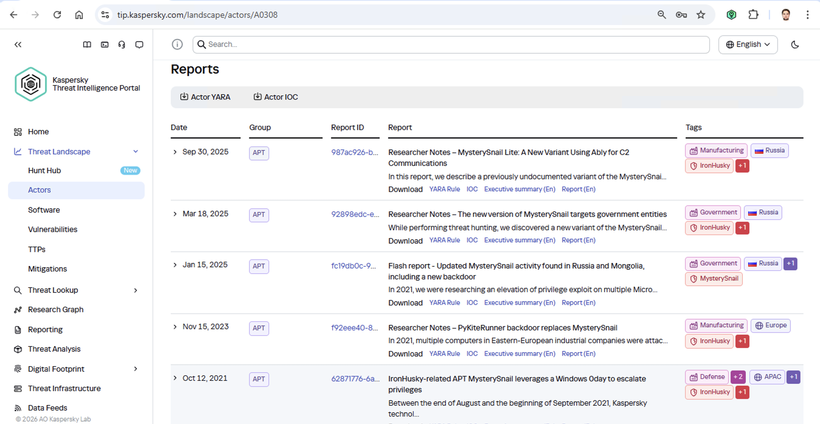 لنفترض أننا قمنا بتحميل عينة من برنامج ضار اكتشفناها إلى بوابة معلومات التهديدات، وعلمنا أنها تُستخدم عادةً من قِبل مجموعة تُدعى MysterySnail على سبيل المثال. ما الذي يخبرنا به ذلك فعليًا؟ دعونا نلقي نظرة على المعلومات المتاحة: