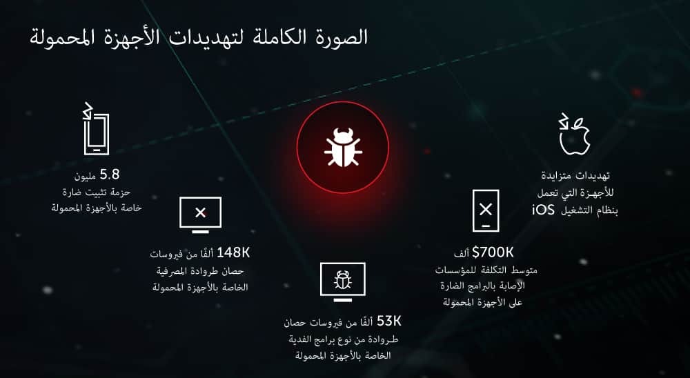 - يشنّ المجرمون الإلكترونيون هجماتهم عبر الأجهزة المحمولة باستخدام أساليب مثل التطبيقات المصابةمستغلين شبكات Wi-Fi العامة ذات مستوى الأمن المتدني والتصيّد الاحتيالي.