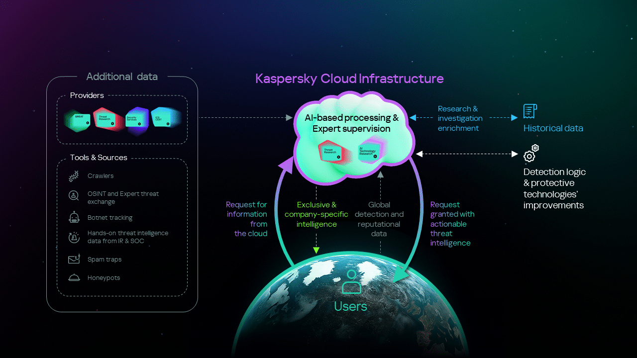 تم تصميم بنية Kaspersky Security Network (KSN) التحتية لاستلام بيانات التهديدات الإلكترونية الشاملة والمعقدة ومعالجتها لتحويلها إلى معلومات متعلقة بالتهديدات تشغّل منتجاتنا ويمكن تنفيذها.
